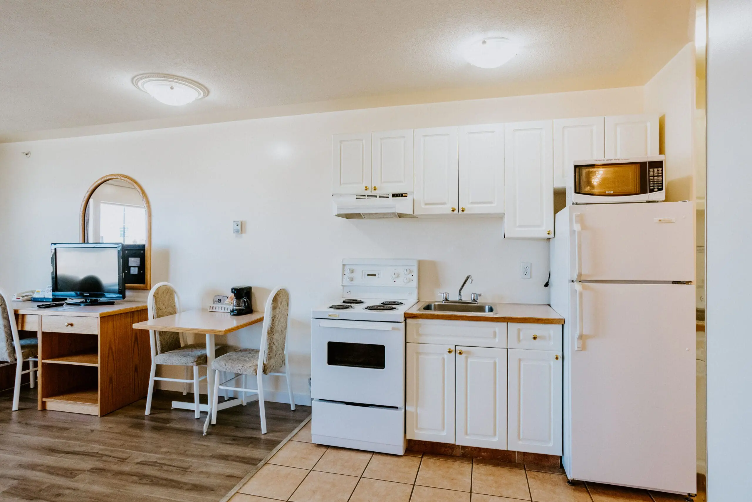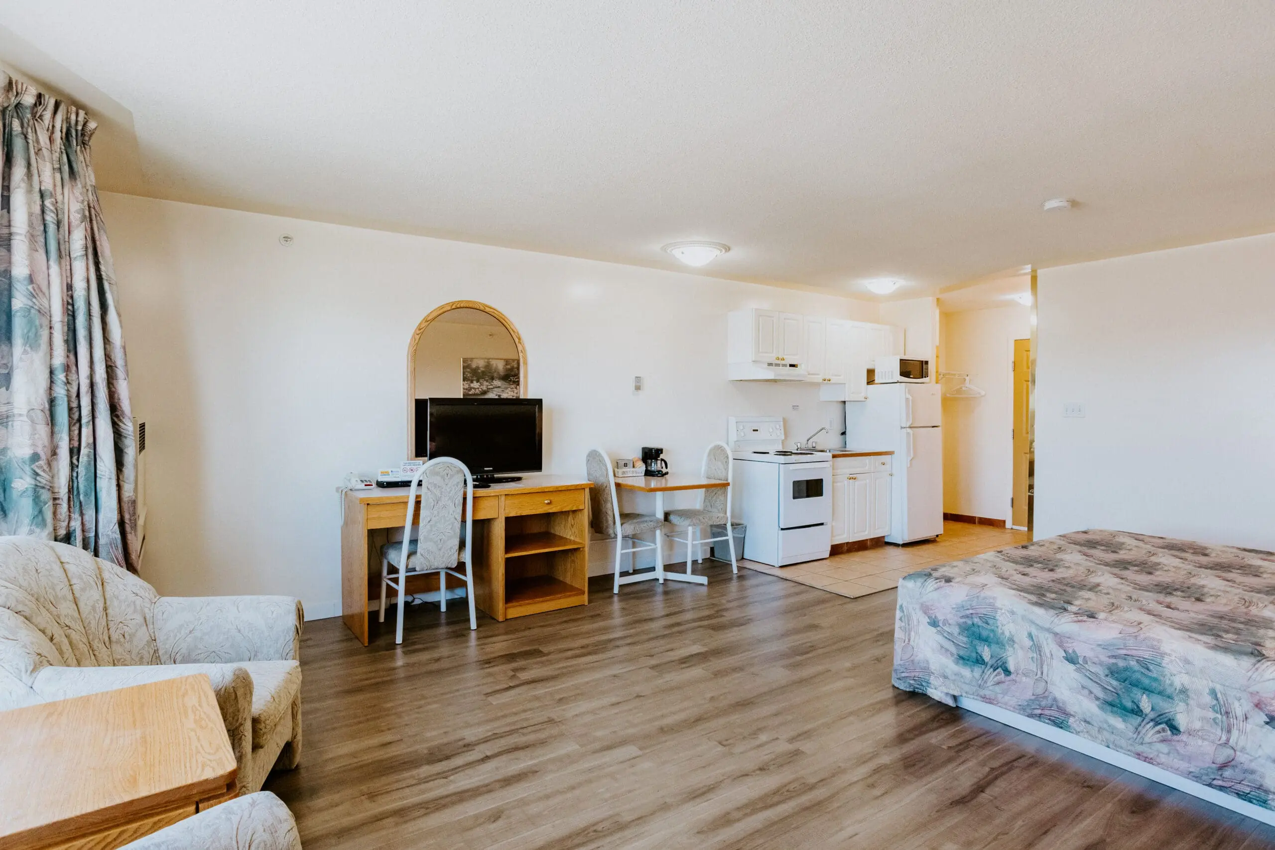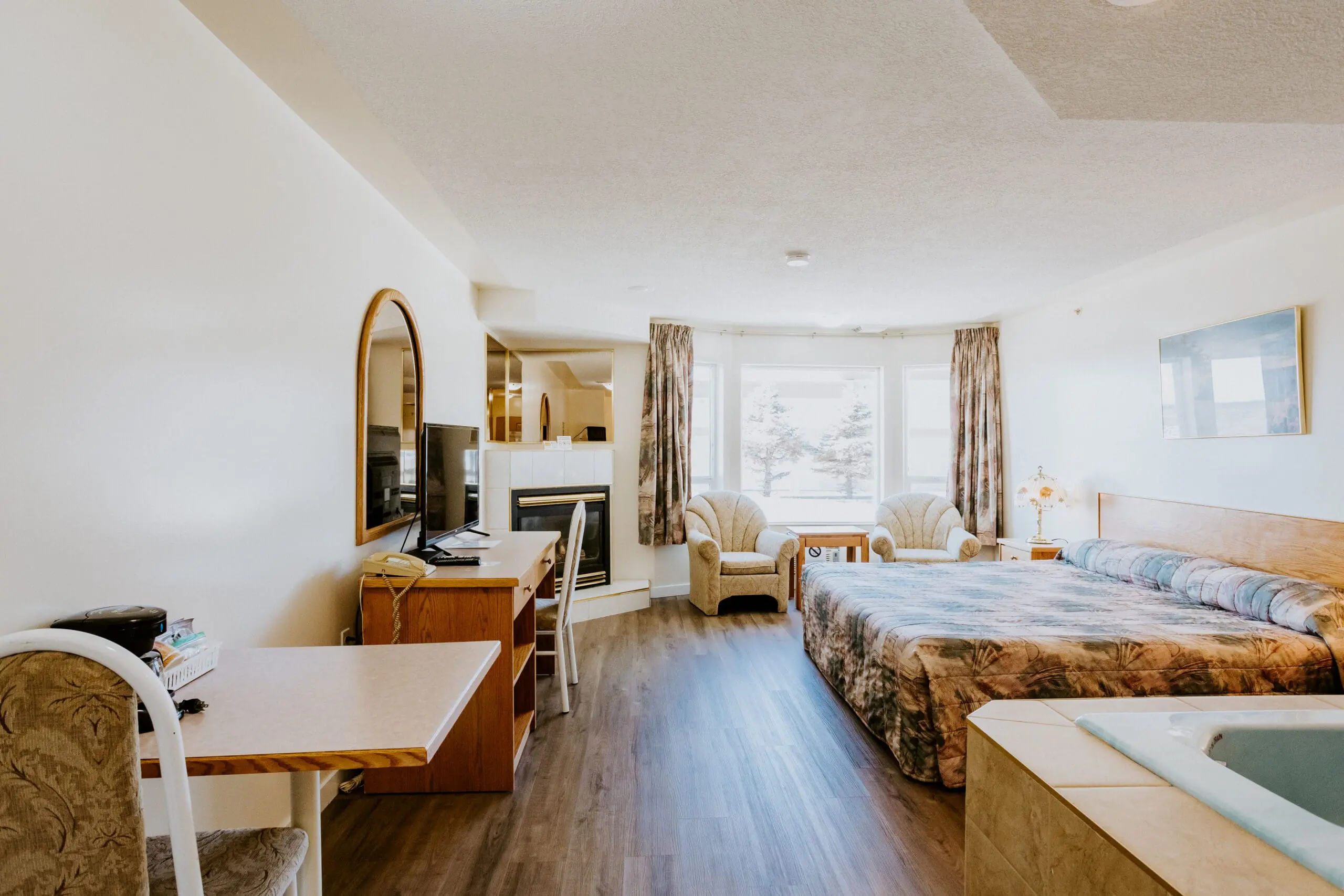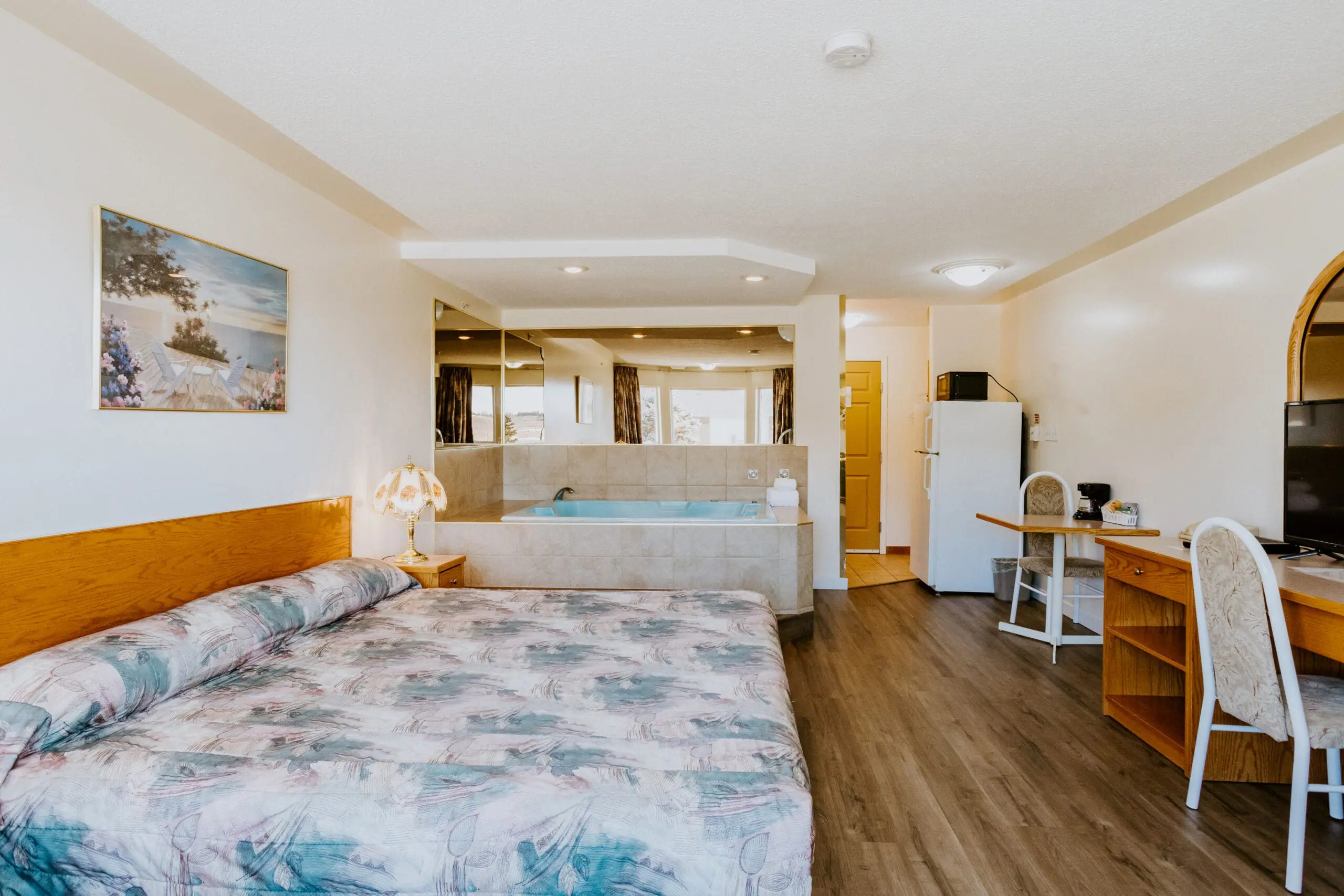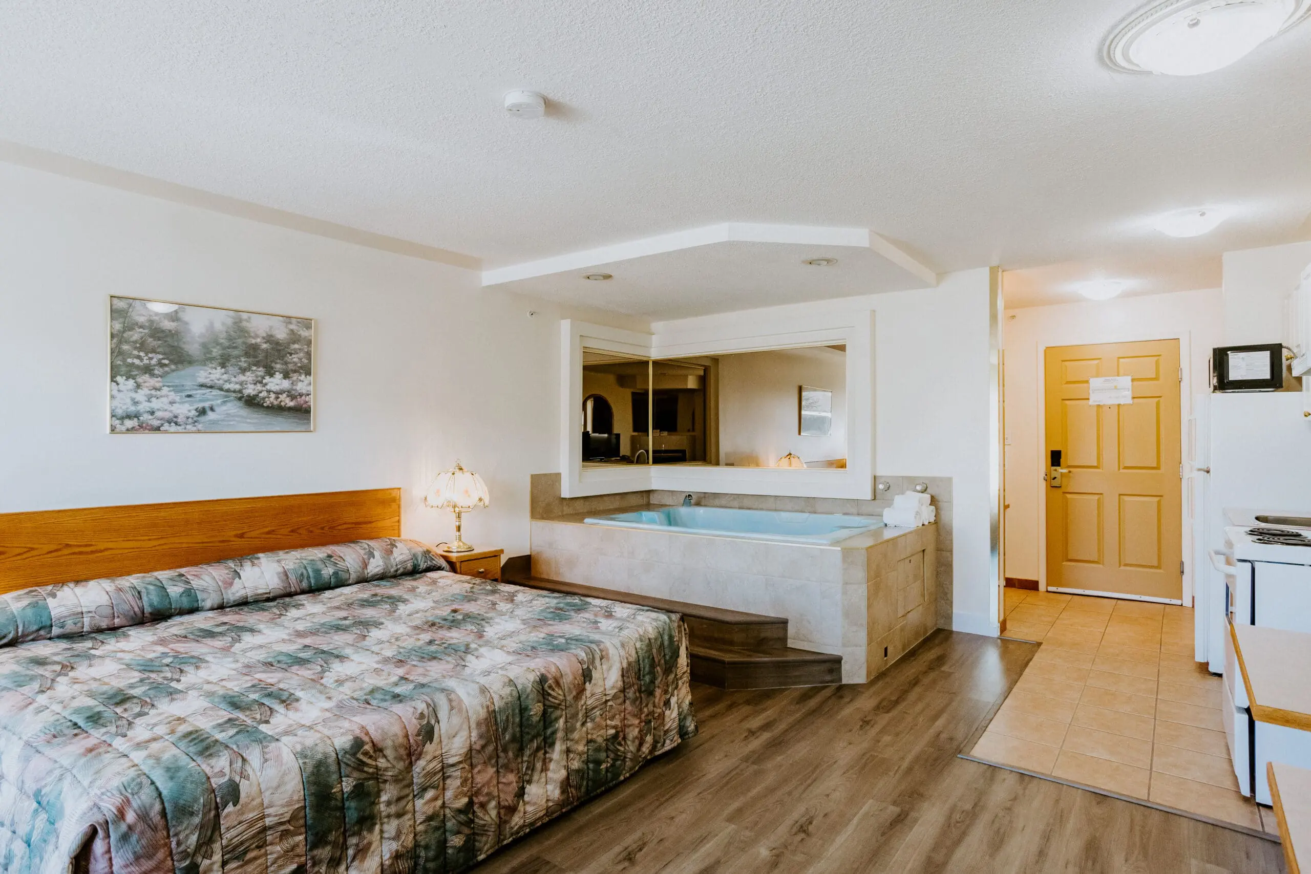 Relax in a spacious suite featuring a king bed, private Jacuzzi, and convenient kitchenette — the perfect balance of comfort and practicality.